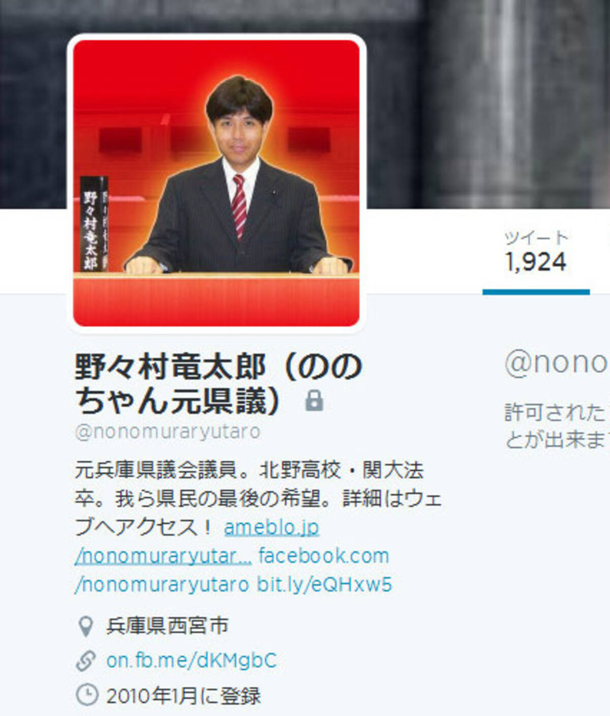 ブログの謝罪文を削除した号泣会見の野々村竜太郎氏 Twitter のプロフィールが ののちゃん 元 県議 に 14年7月13日 エキサイトニュース